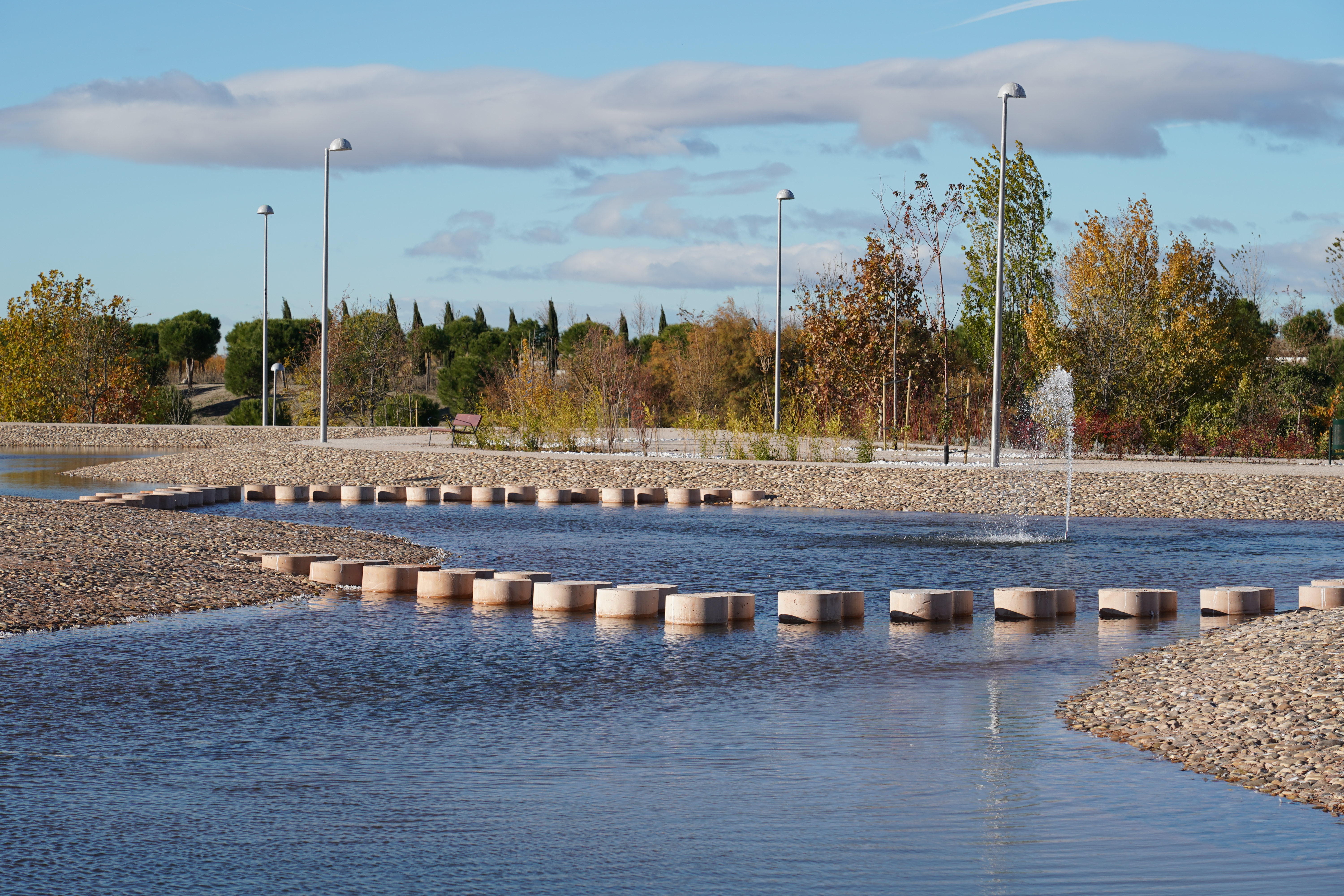 The central estuary divides the space in two. The whole area is crossed by a network of dirt roads, including the Magdalena road or the Cañada del Santísimo, an old rural road. The stream is made up of sheets of water with geysers that flow into a lake. Around there is a promenade with riverside trees and two pedestrian bridges that were already built.