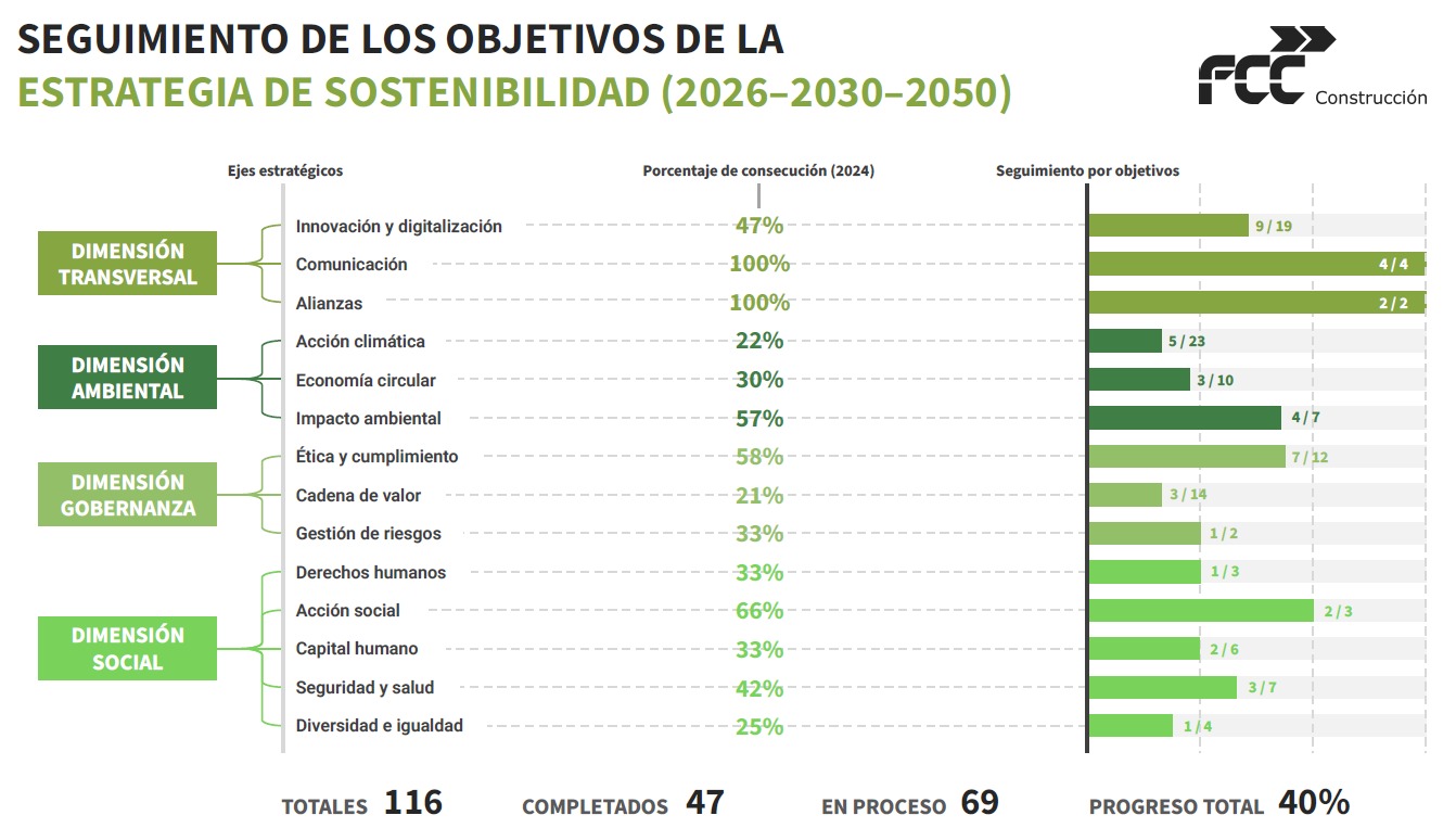 A partir de los resultados obtenidos, la Estrategia de Sostenibilidad de FCC Construcción se consolida como una apuesta firme por transformar los retos del sector en oportunidades de transformación, integrando innovación y responsabilidad en cada dimensión de su actividad.