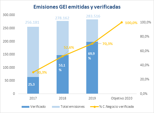 Durante este ejercicio, se han verificado por tercera parte los informes de emisiones de CO2 de 12 países en los cuales la compañía desarrolla su actividad de forma internacional: España, Portugal, Rumanía, Reino Unido, Nicaragua, Costa Rica, Panamá, El Salvador, México, Colombia, Chile y Perú.